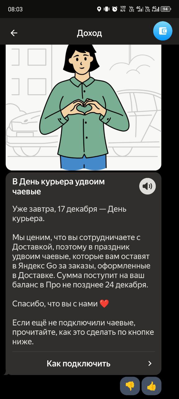 Это я к чему спрашиваю то.. Завтра типа день курьера и Яндекс удваивает чаевые. В прошлом году такая же тема была, в связи с этим и вопрос. Если мне, скажем, 100 тыщ чаевых оставят, их удвоят? 😂