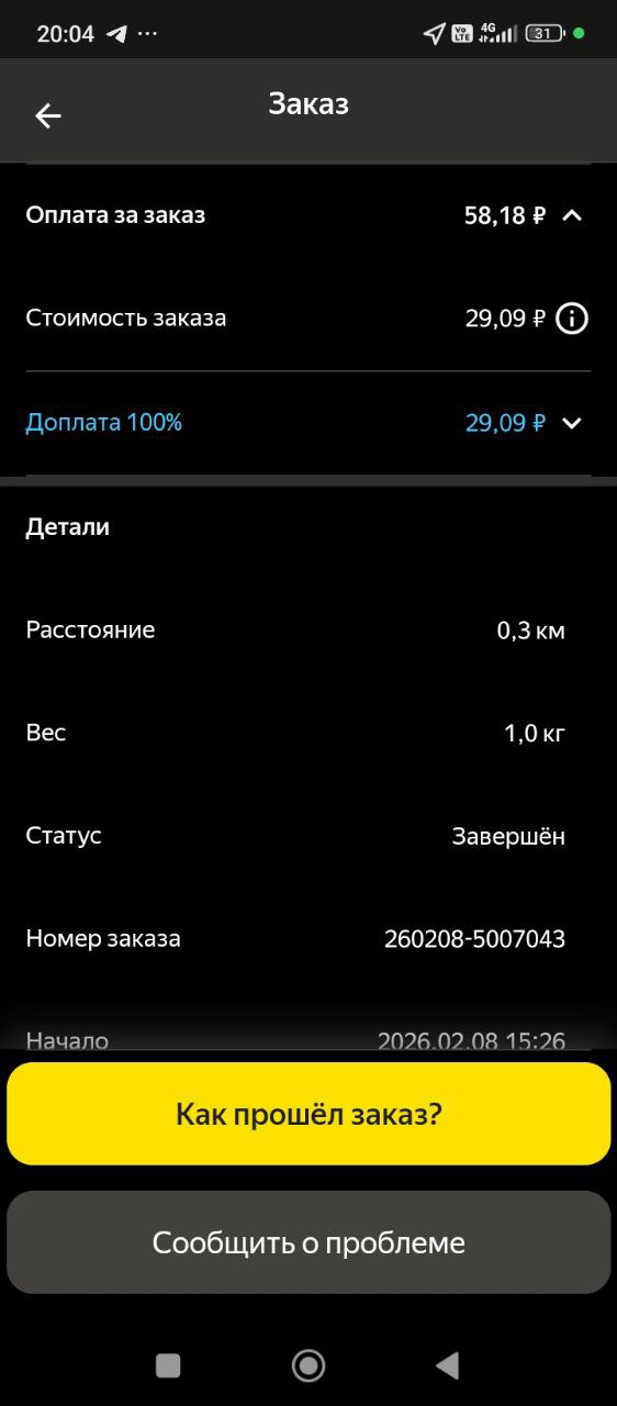 Хотя 1 заказ был достаточно забавный, пришёл зелёный заказ, но по итогу, то есть развёз. И мне, короче, ну, буквально там, блин, минут 20 я потратил времени в общей сложности, и мне за него приходит 600 ₽, короче. Я смотрю, думаю, блин. Ну фигня какая-то. Кэфов не было, ничё не было. То есть почему так вообще непонятно, как яндекс считает. Притом после этого был другой заказ, та же самая фигня, но у меня за него пришло 300.
