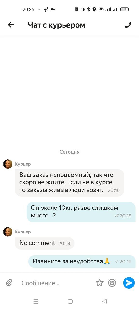 Клиенты только на цену смотрят . Мне вчера заказ пришел. Там от двери до двери. Поднимаюсь, стоит мужик добрый молодец и рядом с ним холодильник . Я говорю это всё мне ? Он головой кивает . Я говорю вы тариф грузовой с курьерским перепутали . Он говорит , нет , я смотрел, там дорого. Я говорю : и как вы это себе представляете ? Он говорит я клиент, Я заказал, дальше ваши проблемы. Посоветовала ему сходить к психологу и ушла . Он заказ не отменял , поддержка что ответила вы знаете, отменяла сама.